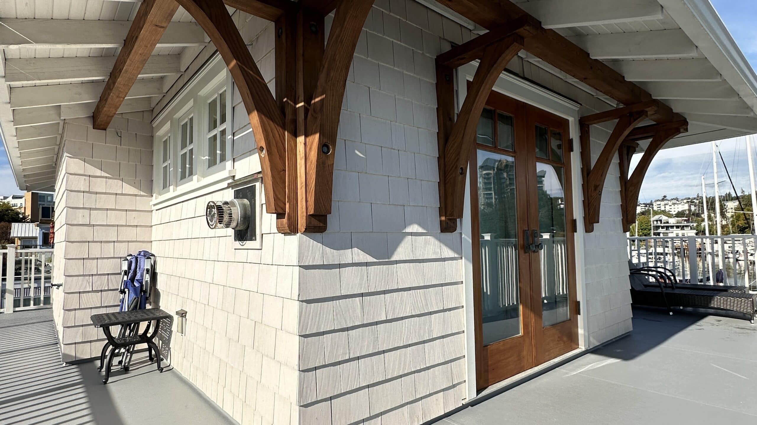 The completed project shows the power of expert exterior refinishing and carpentry repairs. The float home now features a rich, even finish that enhances its natural aesthetic while providing essential protection against the elements. The restored wood surfaces highlight the craftsmanship involved, and the high-quality stains and paints ensure long-lasting durability in a challenging coastal climate.
